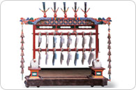 The pyeongyeong is made of 6 L-shaped stone slabs that are suspended from a set of two parallel rods. This instrument produces a clear and consistent tone that remains unaffected by temperature and other environmental factors, making it a popular instrument by which to tune other instruments. Together with the pyeonjong, it is used in Munmyo Jeryeak and Jongmyo Jeryeak ritual music. |