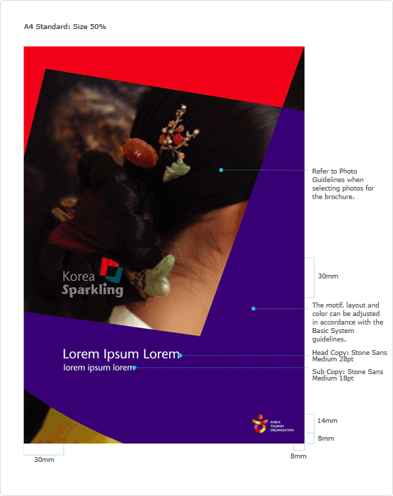 Brochures, being widely distributed, play an important role in creating a unified image of "Korea, Sparkling". While brand expressions and designs can be altered (within brand system guidelines) according to the themes and contents of the brochure, the brochure's size and proportions must follow the provided guidelines.
