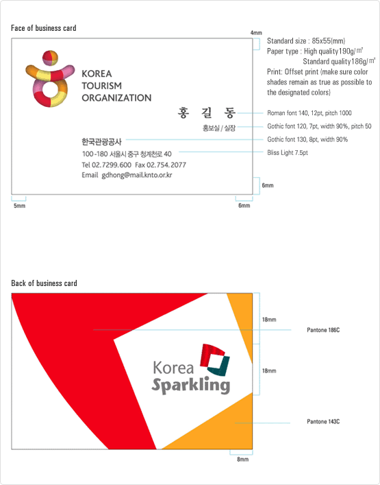 The business card is an important element in expressing the "Korea, Sparkling" brand. When printing it, the layout, signature, and color must strictly follow the provided guidelines.