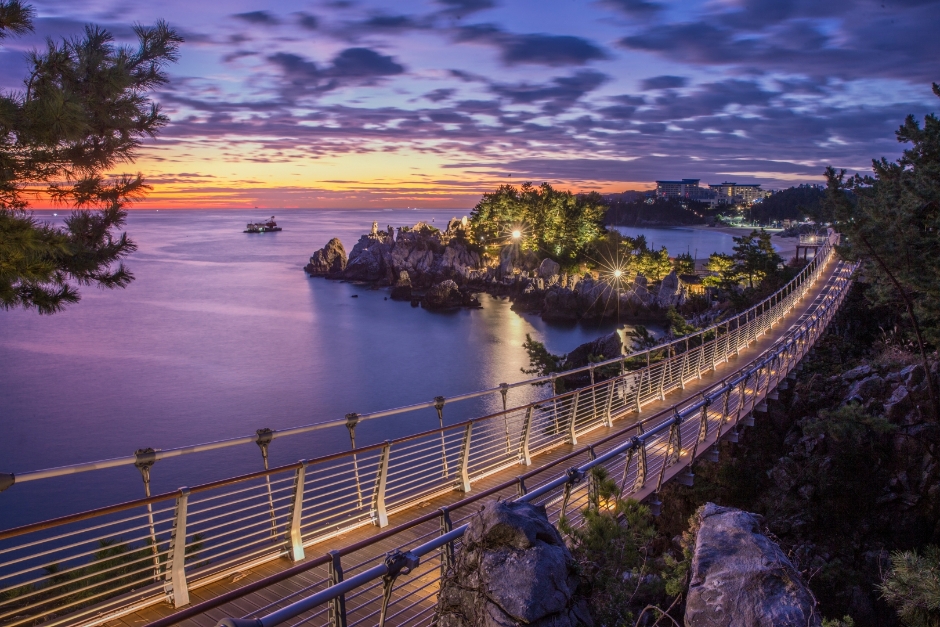 Chuam Beach is a white sandy beach with various unique rock formations. Even though the beach itself is small, there are plenty of things to see like beautiful sunsets, a suspension bridge over the ocean, and the famous Chotdaebawi Rock. The suspension bridge is a perfect photo spot with the East Sea in the backdrop. There is also Haeamjeong Pavilion, first built in 1361 and renovated in 1790. Chuam Sculpture Park at the end of the suspension bridge is also worth a visit.