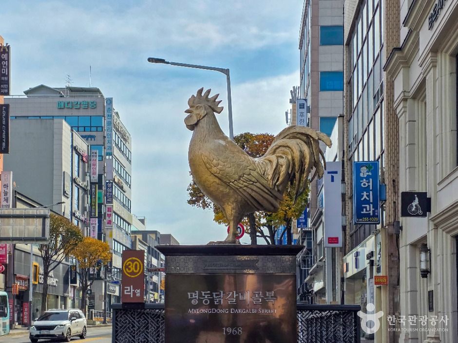 This alley is lined with dakgalbi (spicy stir-fried chicken) restaurants in Myeong-dong, which is Chuncheon's main street. Chuncheon-style dakgalbi originates from the story in which people marinated chicken instead of pork and grilled it with charcoal like pork ribs in the 1960s. Later, various vegetables, such as cabbage and onion, were added to the dish and stir-fried together on an iron plate. As people can eat it plenty at a reasonable price, dakgalbi has been popular among college students and soldiers, and at this time, dakgalbi earned its nicknames such as “People’s galbi (ribs)”, and “College students’ galbi.” The Dakgalbi Alley was established as dakgalbi restaurants were opened one by one on the backstreet of Myeong-dong in Chuncheon, in the 1970s to 1980s. Currently, this 150-meter-long alley is packed with dakgalbi restaurants on both sides. Along with charcoal-grilled spicy chicken and spicy griddled chicken, customers can try Chuncheon buckwheat noodles, which are also a famous local delicacy. The information panel explaining the history of Chuncheon spicy stir-fried chicken is installed in the alley. This alley is also known for the filming location for the Korean TV entertainment program Infinite Challenge and other programs.