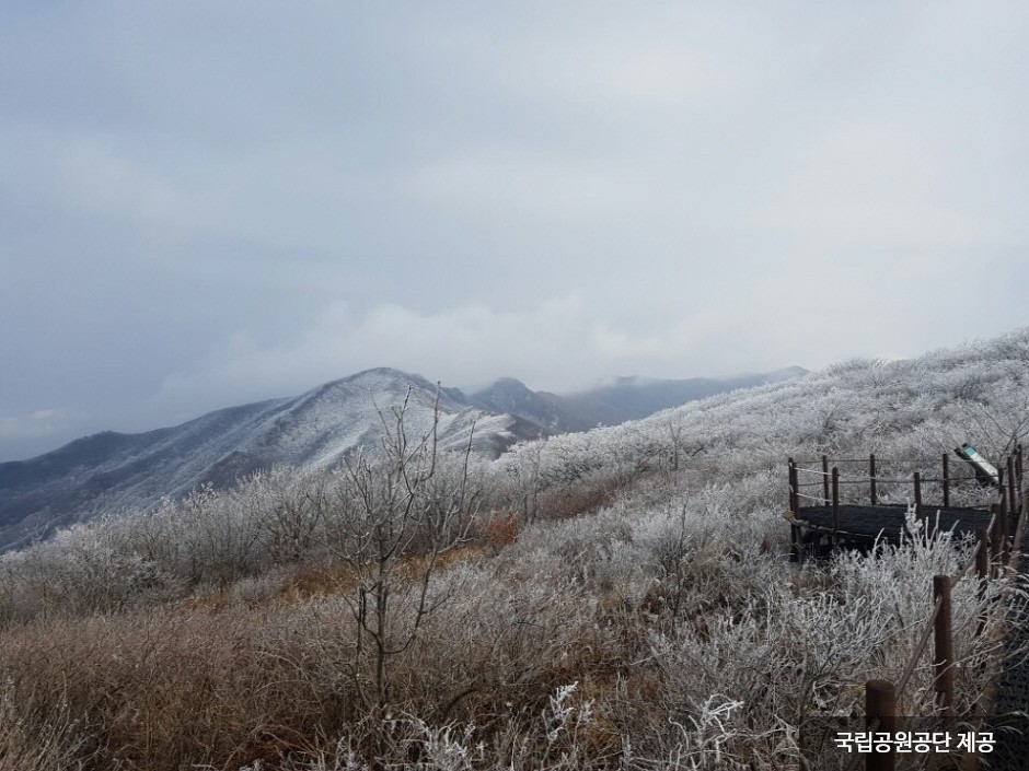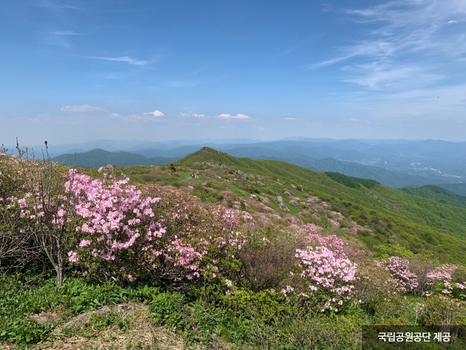 Sobaeksan National Park was designated as the 18th national park in December 1987. The features of Sobaeksan National Park include wildflowers and royal azaleas in spring and snowy scenery in winter. The mountain borders three provinces and four cities. Attractions include various peaks, temples, and waterfalls. The mountain is especially popular in May when royal azaleas are in full bloom and a natural forest tunnel is formed. Birobong Peak of the mountain is covered with snow six months of the year and is called the Alps of Korea.