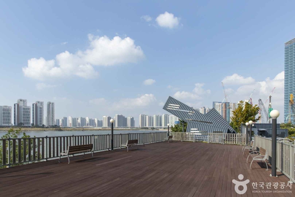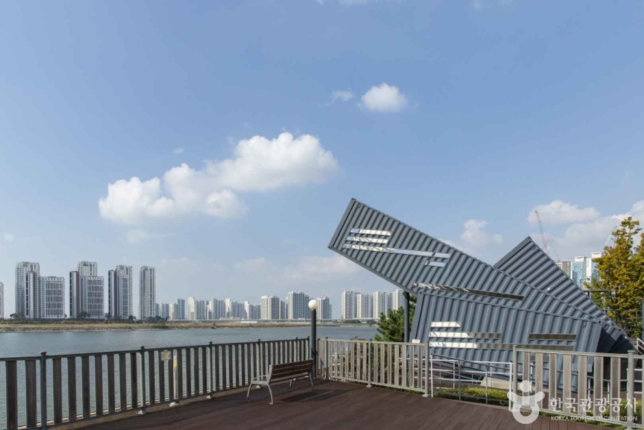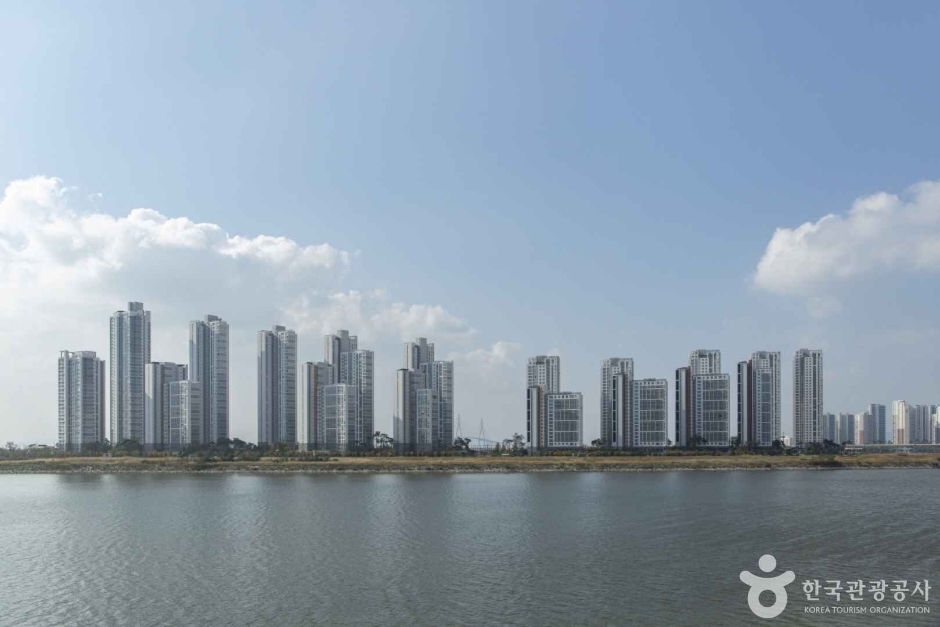 Incheondaegyo Bridge Observatory is located in the best spot to appreciate the bridge's beauty, stretching across the open sea. Visitors can enjoy the view from the ocean scope in the uniquely designed container building, or sit on one of the benches that line the wooden walkway. The view inland shows the skyscrapers of Songdo.