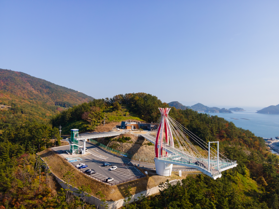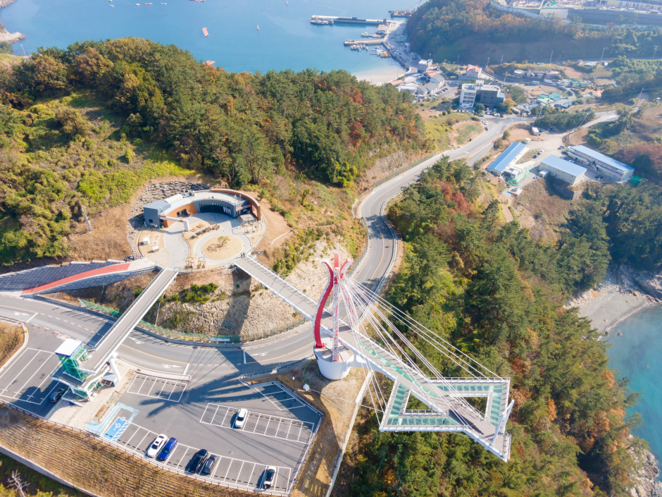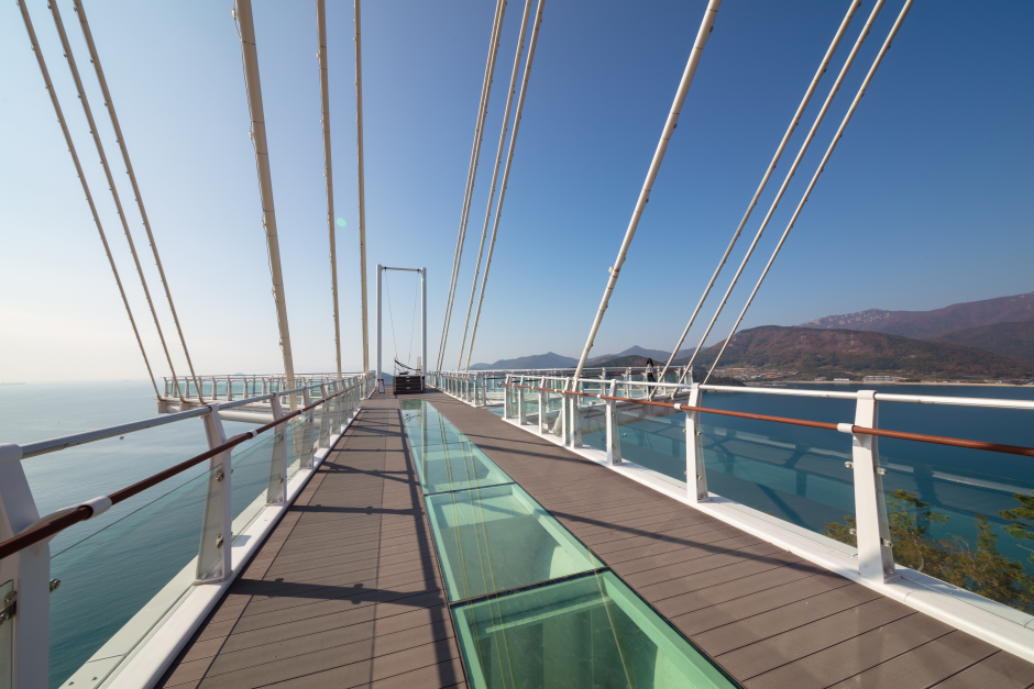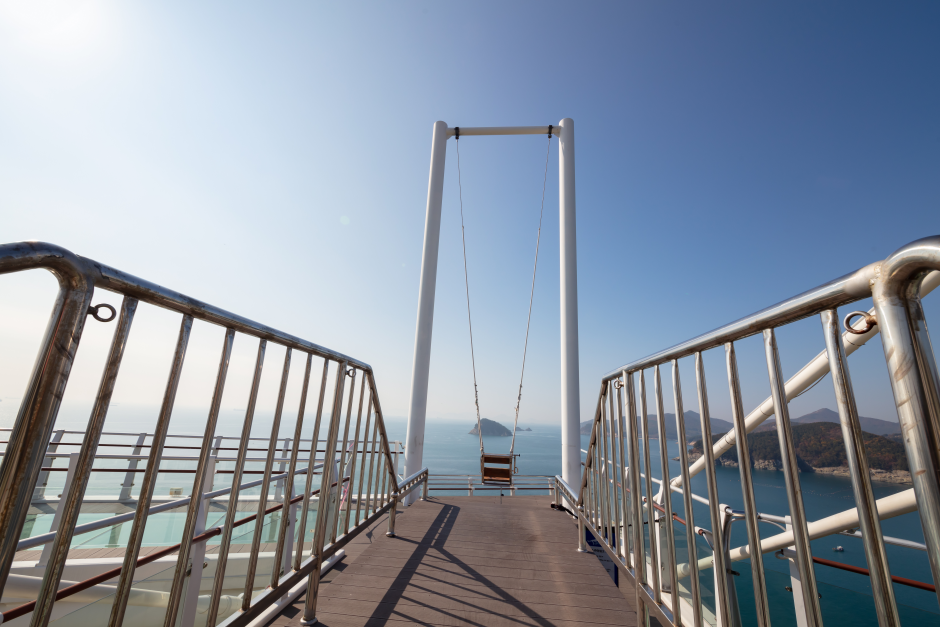 Seolli Skywalk in Namhae offers panoramic views of the entire area. The first asymmetrical cantilever bridge in the nation, the skywalk stands at 36 meters off the ground and stretches 79 meters with a width of 4.5 meters. Nearly 43 meters of the length are on the suspended side of the cantilever, the longest in the nation. At the end of the walkway is a swing, designed with a them of "swinging in Bali.
