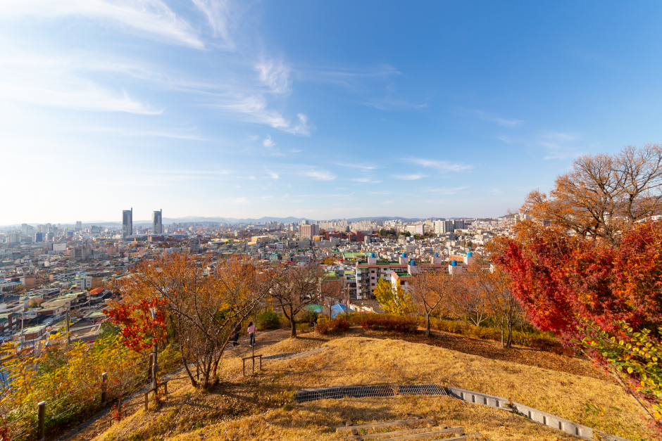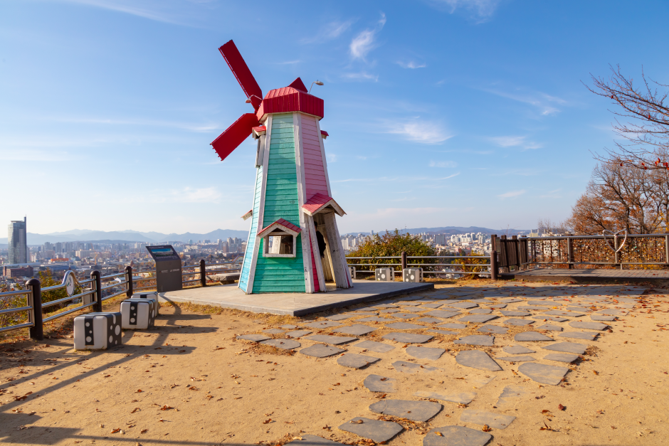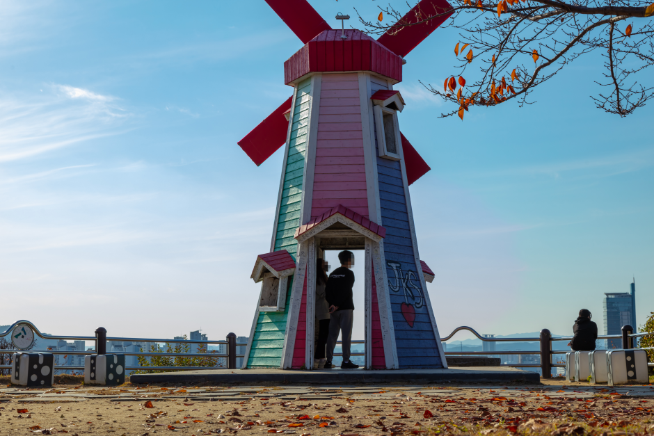 Daedong Sky Park was formed as part of the Rainbow Project on December 2009. A giant windmill, which represents the park, is located 127 meters above sea level. Visitors can see an amazing panoramic view of the city as well as relax at one of the many benches and pagodas. A mural village connected to the Sky Park offers themed coffee shops and has become a popular attraction.