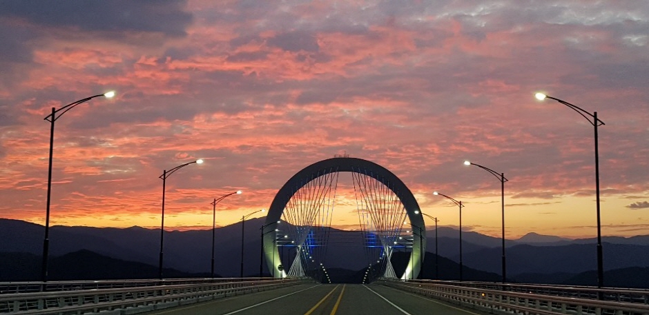 The Soyanggang Skywalk, extending over the river, spans 174 meters in length, with a transparent glass floor covering 156 meters of its section. At the end of the skywalk, visitors will find a circular plaza and an observatory, renowned for their panoramic views, especially of the sunsets. Additionally, the Ssogarisang sculpture, depicting a leopard mandarin fish, stands on the opposite side of the plaza, drawing in visitors. Water from a fountain flows from this sculpture at fixed intervals, adding to the allure.