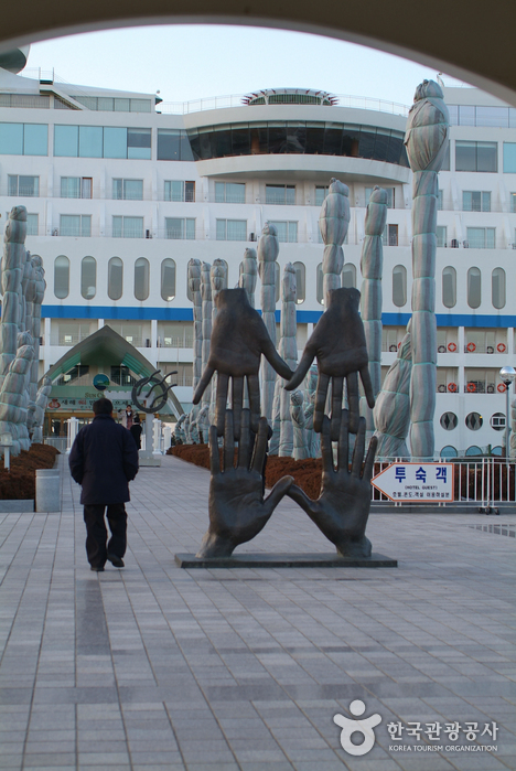 Sun Cruise Resort is a cruise-shaped resort located on a cliff 60 meters above sea level. Surrounding the resort is an extensive park, with themed gardens and sculptures. The park offers an exquisite landscape with its large man-made lake and coconut trees. The resort also has a sculpture park that displays 30 sculptures and a jangseung (traditional Korean totem pole) park with 250 jangseung totems from Andong. Visitors can also stop for a cup of coffee at a train-themed cafe or a sailboat-themed cafe.