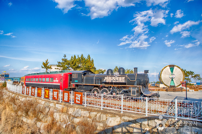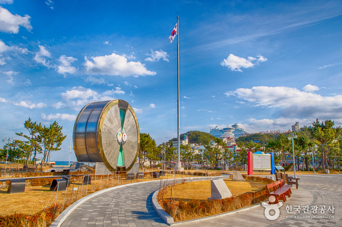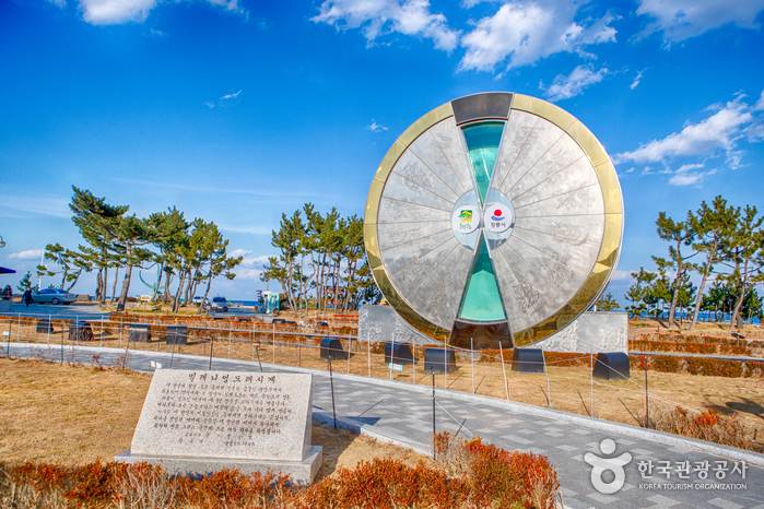 Sandglass Park is surrounded by the East Sea, mountains and Jeongdongjin 2-ri Village. Sandglass Park has pine trees, benches facing the sea, and access to Jeongdongjin Beach. At the center of the park is a giant sandglass that is set to measure one year. Sandglass Park was established in 1999 by the city of Gangneung and Samsung Electronics Co. to commemorate the upcoming millennium. Part of this commemoration was the building of the giant sandglass at the park. The sandglass has a diameter of 8.06 meters, width of 3.2 meters, weight of 40 tons and holds 8 tons of sand, making it one of the biggest sandglasses in the world. It takes a whole year for sand to trickle to the bottom and then the sandglass restarts again on New Year’s Day each year at midnight.