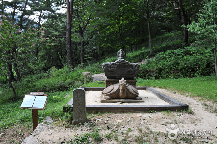 Acording to legend, Yeongi discovered a pond in the current sanctuary area when reading about the land's topography. While he was looking at the middle of the pond, one swallow flew from a whirlpool. After that, the pond began to dry up and the place was then used for the temple. As such, the name Yeongok refers to the phenomenon of "Yeon," a swallow, and "Gok," a valley. There is a memorial plaque for Go Gwang-sun, a patriotic leader who fought against Japanese power during the Japanese colonization period while taking shelter at Yeongoksa Temple