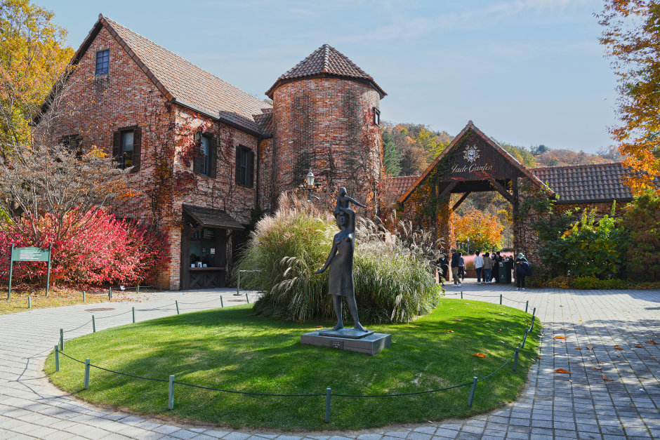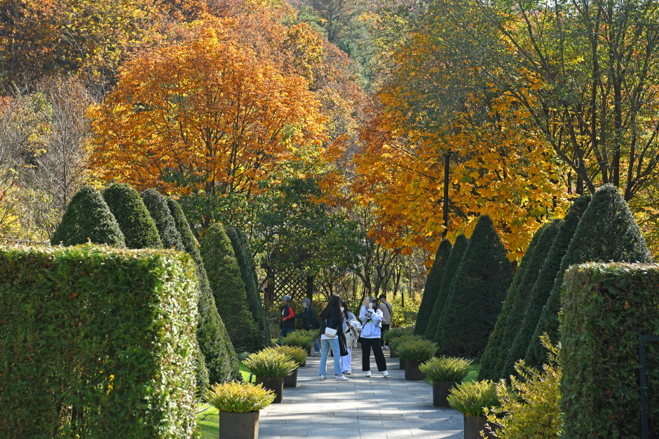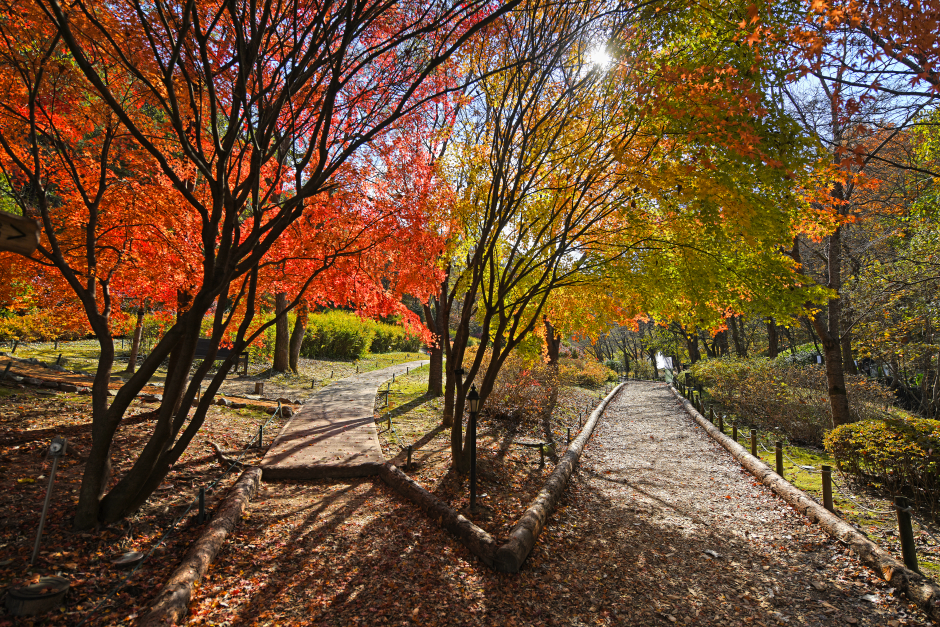Jade Garden is an exotic arboretum established with the theme of “small Europe in the forest.” It was built on an area of 163,500 m2 by keeping its natural topography and establishing 24 themed gardens. This European-style arboretum comprises Italy’s Tuscan-style Visitor Center at the entrance, English Border Garden, and Italian Wedding Garden built with Italian style of garden and waterway. It also has three walking paths -Namunaeum-gil, Danpungnamu-gil, Supsokbaram-gil. Namunaeum-gil in the middle of the arboretum is paved with woodchips and has good accessibility to the theme gardens. Danpungnamu-gil located at a high ground is a quiet trail, while Supsokbaram-gil is surrounded by thick trees and an ideal walking path in the summer season. Each walking path requires 40 to 60 min each way, and they are connected in the middle of the trails. Each path begins from the Visitor Center and ends at the White Garden or Sky Garden at the top of the arboretum. Visitors can take a rest at a cafe, restaurant, and souvenir shop. The nighttime operation is available depending on the season, and the shuttle bus runs between Gulbongsan Station of the Gyeongchun Line and the Arboretum.