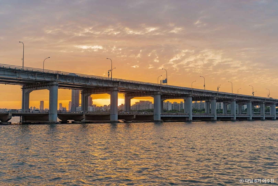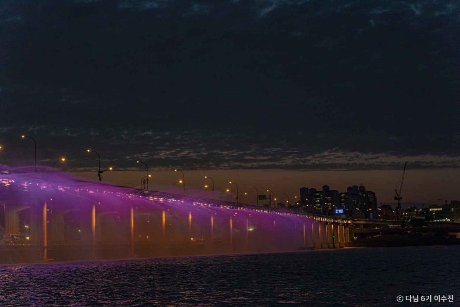Banpo Hangang Park is located on the southern side of the river centering on Banpo Bridge (Jamsu Bridge) between Hamnam Bridge (upstream) and Dongjak Bridge (downstream). The Rainbow Fountain built on both sides of Banpo Bridge was registered in The Guinness Book of Records in 2008 as the longest bridge fountain in the world with a total length of 1,140 meters. At night, over 200 lights create a fantastic view of a beautiful rainbow.