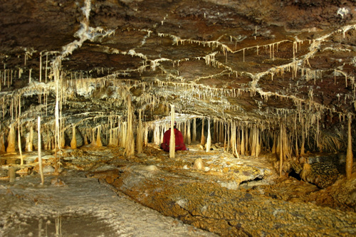 of lime substances that have accumulated in the ground above the tube. The tunnel has a spectacular and mystical beauty with countless stalactites and stalagmites, as well as stalactite columns. The particularly thin stalactites and stalactic columns in this cave are well-known for their uniqueness and beauty. Although this is a relatively small lava tunnel, its exotic colors and the richness of the secondary topological formations make it extraordinary in terms of research value. This cave has been designated natural monument.