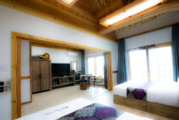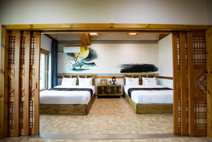 Yeongjogwan is named after the 21st Joseon king Yeongjo and is in a complex of 11 hanok buildings named for Joseon kings. The hotel is in Wansan-gu, Jeonju, Jeollabuk-do, looking out over Jeonjucheon stream. Yeongjogwan has two first-class rooms, each with a bedroom containing two double beds, a living room, a bathroom with a jacuzzi, and a toilet. Guests can experience traditional games on the outdoor lawn, and breakfast is served at Hyangwonjeong, a hanok restaurant in the same complex. Nearby tourist attractions include Jeonju Hanok Village, and Nambu Market (just 5 minutes away by car).