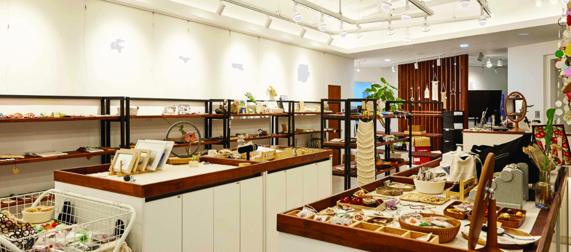 A souvenir shop showcasing handmade crafts by local artists of Jeju. The shop features a diverse array of items, including fabric products, stationery, and recycled goods.