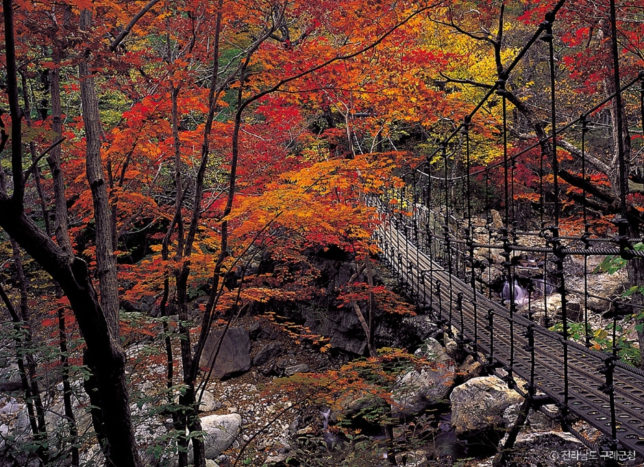 Piagolgyegok Valley is located in Jirisan Mountain between Nogodan and Banyabong Peaks. The name of the valley comes from the crimson red maple leaves that fill the valley in fall. It is also one of the ten most beautiful highlights of Jirisan Mountain. The valley is famous for its fall colors, but it is also a beautiful place to visit all year around, from azaleas in spring to snow-covered rocks in winter.