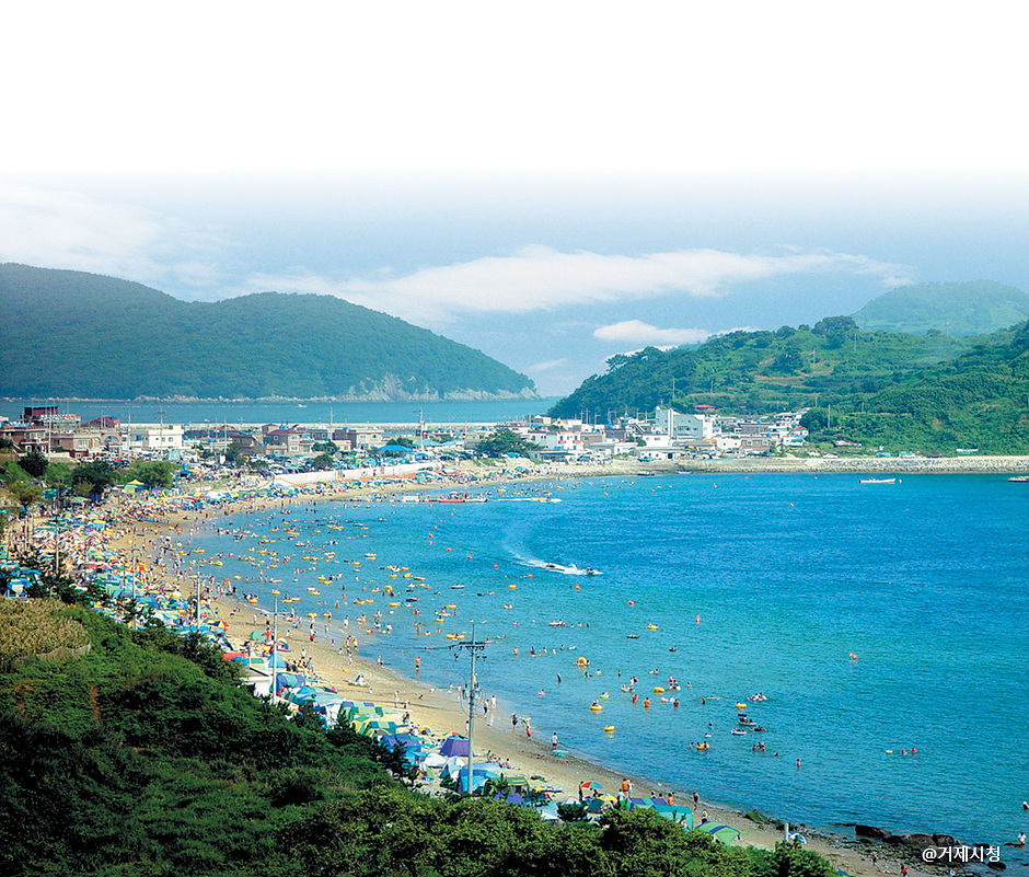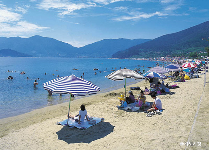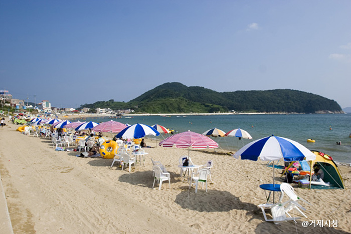 Gujora Beach is not only known for its natural beauty and crystal clear water, but also as a beach that can be reached conveniently. It was initially used by U.S. soldiers when a prisoner-of-war camp was established in Geoje in the aftermath of the Korean War. After the beach was opened to the public in the 1970s, it became better known for its natural beauty than its military history. The beach is relatively shallow with warm water and stretches 1.1 kilometers long and has a width of 30 meters. It has many nearby attractions such as Mangsan Mountain, Sujeongbong Peak, Anseom Island, and Yundolseom Island, creating a beautiful view.