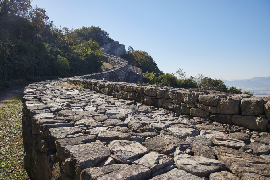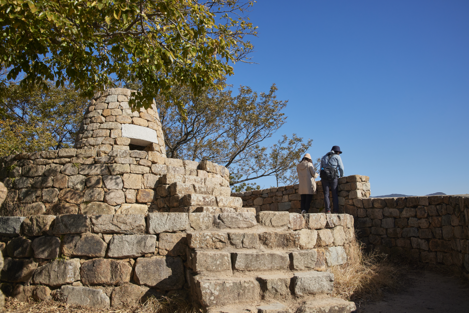 Bunsanseong Fortress was constructed in the 3rd year of the reign of Goryeo's King U (1377) by Magistrate Park Wi to defend against foreign enemies, but it was destroyed during the Japanese invasion of 1592. The fortress we see today was reconstructed by Magistrate Jeong Hyeon-seok in the 8th year of the reign of Joseon's King Gojong (1871). However, it is estimated that it was first built during the days of Gaya. It is a temoe-style fortress with rocks piled up like a long band at the peak of Bunsan from which downtown Gimhae, Gimhae Plains, the Nakdonggang River and the South Sea are all in a single, panoramic view. Today, fortress walls remain stretching for some 900 meters on the slope towards the city and, inside the fortress, there are two gate sites in the south and north, an auxiliary gate on the west, a well site and several other building sites. The exact length of the remaining fortress walls is 929 meters and the average width is about 8 meters.