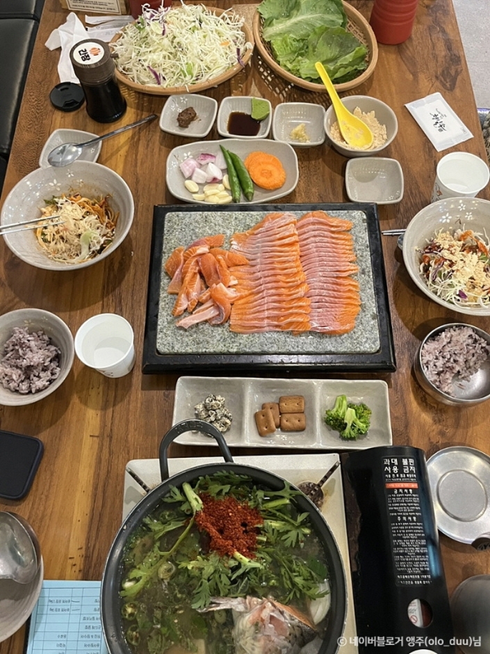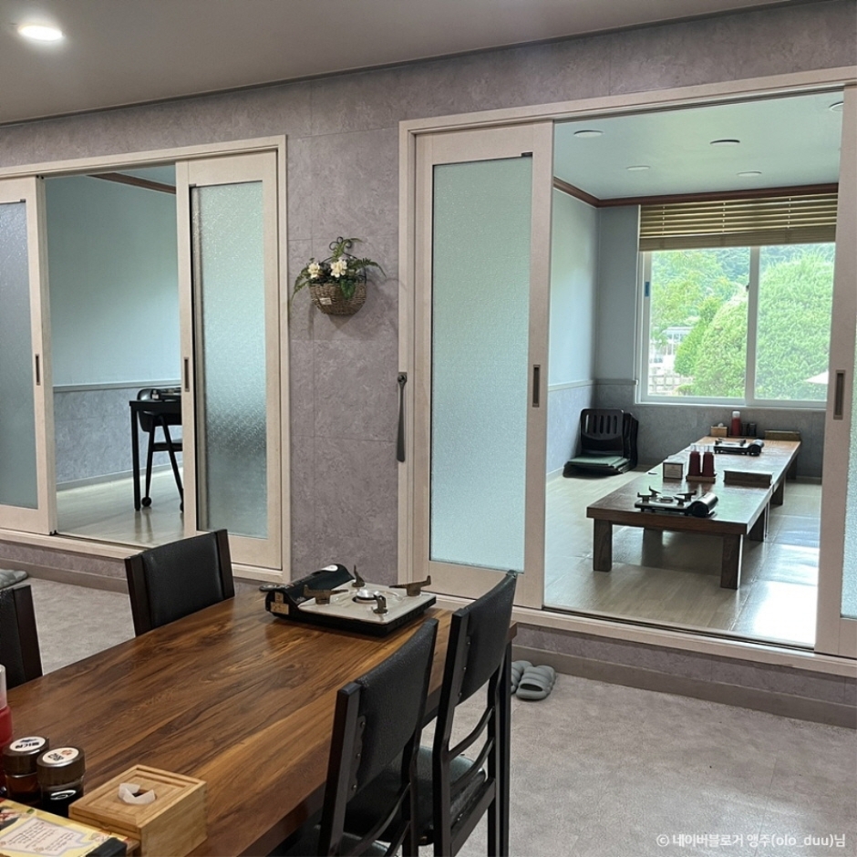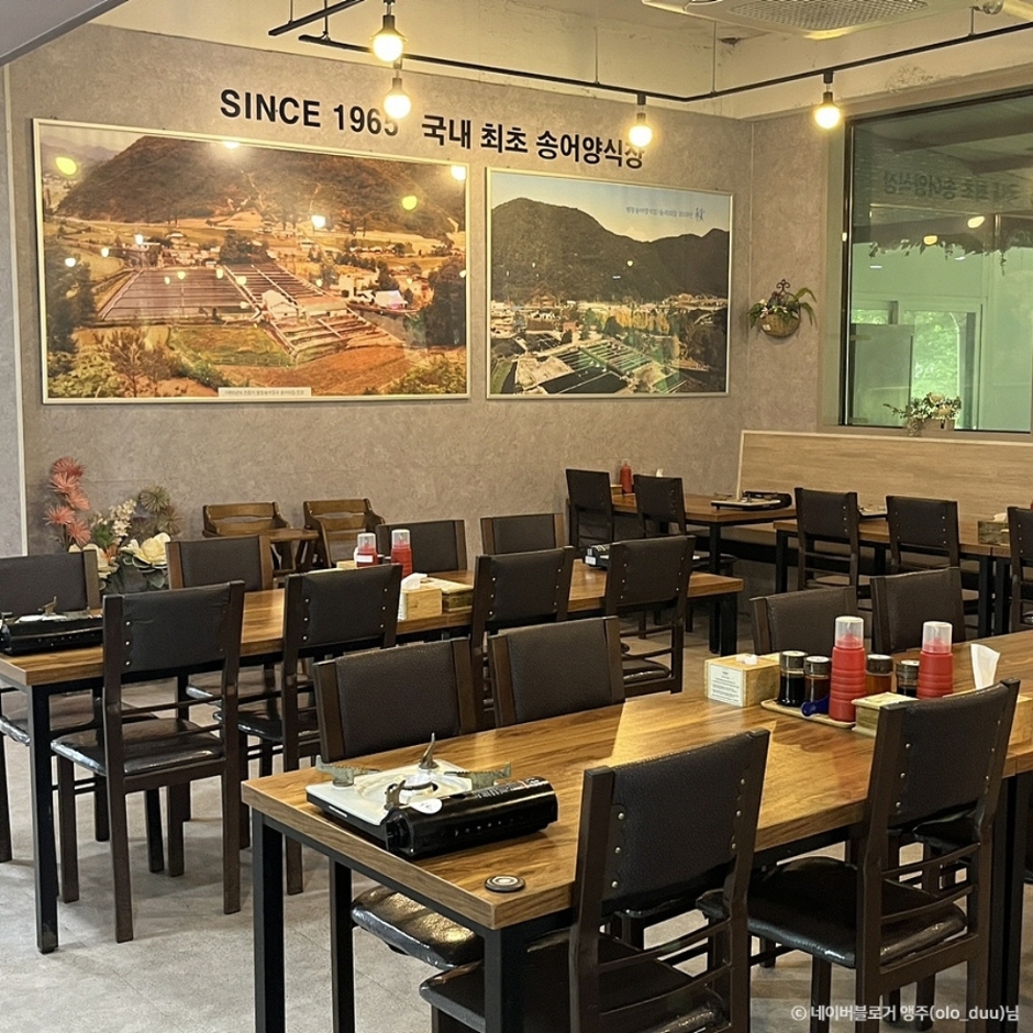 Trouts House is a unique establishment that combines a trout hoetjib with a trout farm. They meticulously maintain an optimal environment for trout farming, which yields fish with a chewy texture, free from any fishy aftertaste, and characterized by a delicate, clean flavor. The restaurant offers various trout dishes for guests to enjoy. Options include muchim where trout is mixed with vegetables, soybean powder, sesame oil, and minced garlic, and deopbap, where trout is served over rice. In addition to songeo hoe (sliced raw trout), their menu also features songeo gui (grilled trout), songeo twigim (deep-fried trout), and a dish with thistle rice.