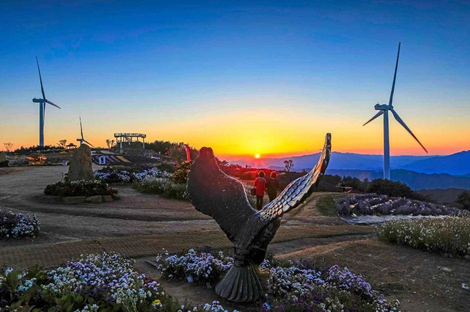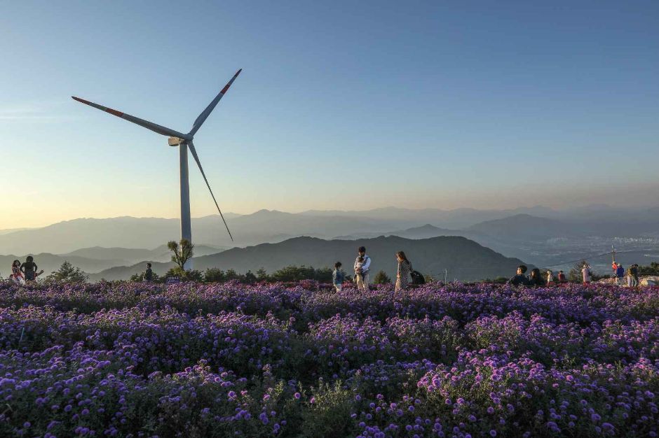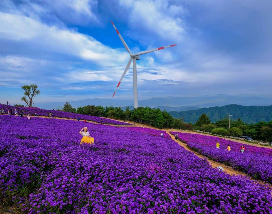 Gamaksan Wind Farm is a wind power complex located near the summit of Gamaksan Mountain in Geochang. The site, once a barren land, has been transformed into a flower garden with the planting of flowers such as Mother Chrysanthemum, Aster, Siberian Chrysanthemum, and Sliver Grass. It offers a panoramic view of Geochang-eup and Hapcheonho Lake. There are photo zones scattered throughout, providing excellent opportunities for photography. One of the main events is the Flower & Star Festival held in October. Visitors can enjoy vibrant purple asters and participate in programs like forest ecology experience and aromatherapy.