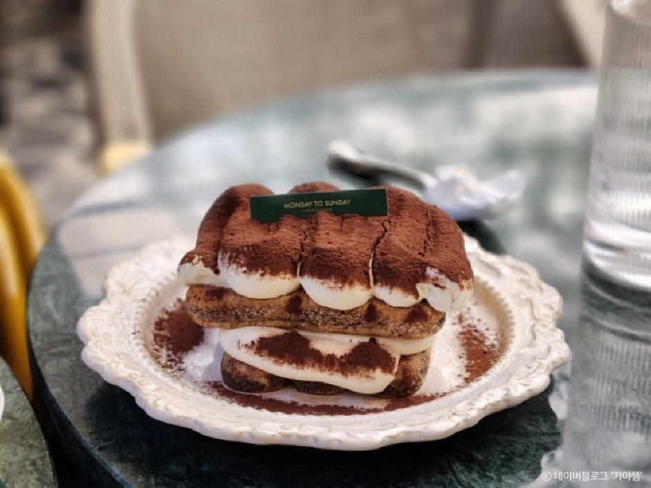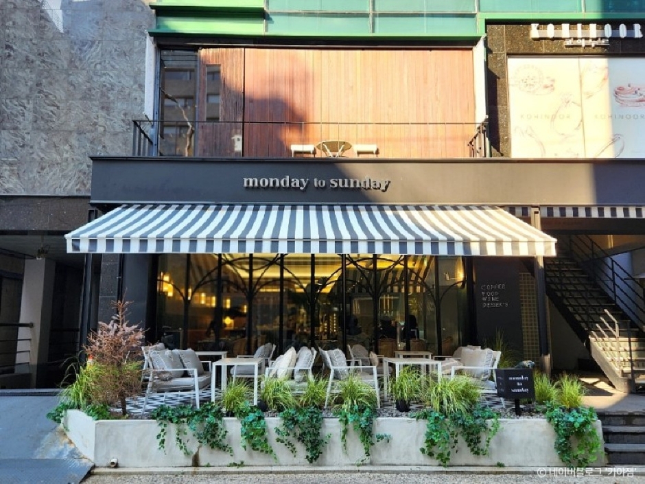 Monday to Sunday, located in Cheongdam-dong, is a delightful spot for coffee, brunch, and desserts. It boasts a broad terrace area and a generously sized interior, where they take pride in making their own cakes on-site. The café's signature dish is the tender homemade lemon dill cheesecake, crafted with fresh lemons and aromatic dill. Another crowd favorite is the fresh grapefruit, served scooped with a touch of added honey, making for a refreshing treat.