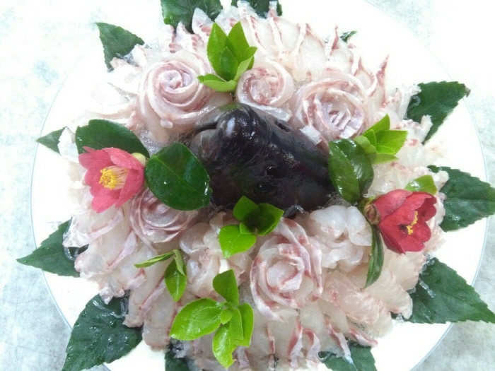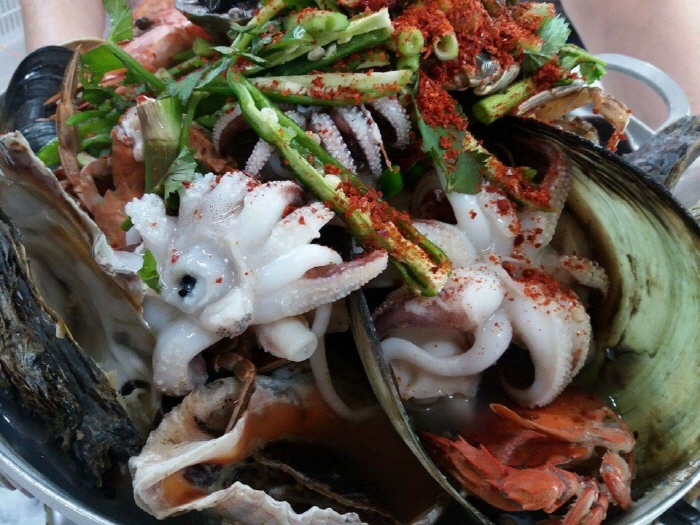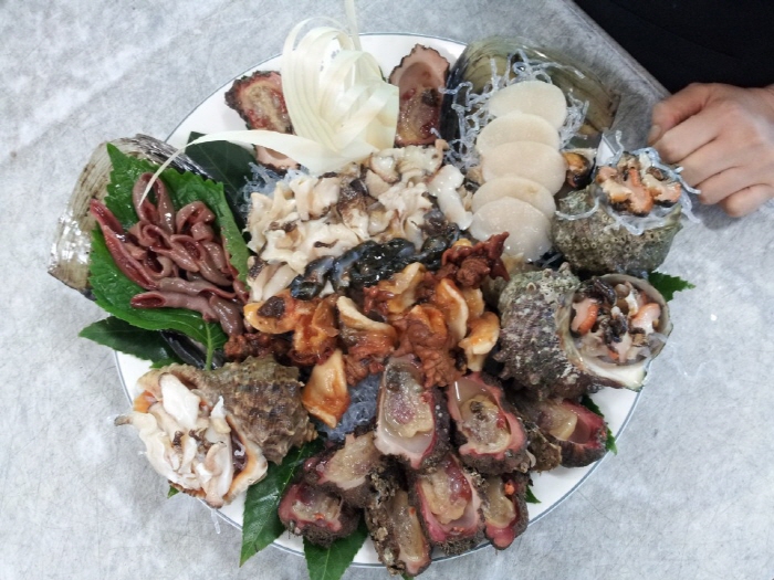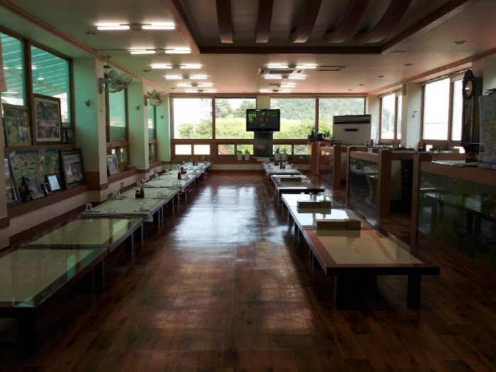 Haegeumgang Cheonyeonsong Hoe Restaurant specializes in hoe (sliced raw fish) prepared with fresh, live fish caught by haenyeo (female divers). The main characteristic of this restaurant is that the customers enjoying their meal late afternoon can watch a magnificent view of the sun setting between Haegeumgang River and Sajabawi Rock.