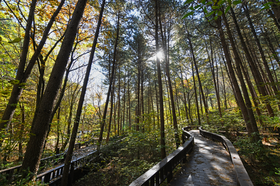 Saneum National Recreational Forest is located in Danwol-myeon in Yangpyeong. It opened on January 1, 2000 and can accommodate up to 2,000 visitors a day. The park's name "saneum" means "mountain shade," a name given for its geographical location where it is surrounded by other mountains on all sides. The park's lush forest is home to diverse species of wildlife and the valley boasts spectacular views.