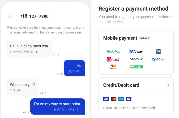 To use Kakao T, you must first make a Kakao account through Kakao Talk, a Korean messenger app. You can use your local mobile number to sign up. After making your Kakao account, download and install Kakao T on your mobile device to call a taxi. You can pay by cash, credit card, or Tmoney card to the driver directly or use the auto-pay feature. In 2024, Kakao Mobility launched k.ride, a foreigner-exclusive taxi app, which doesn’t require you to sign up on Kakao Talk. It is available in English, Japanese, and Chinese (traditional & simplified), and offers over 100 language auto-translation options for browsing destinations and chatting with the driver. It also allows international travelers to register their own credit card on the app for convenient mobile transaction.