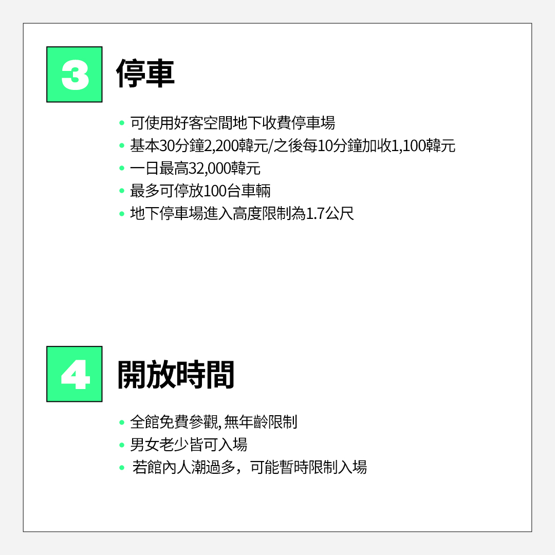 入庫から最初の10分以内は無料 / 以後30分毎に1,200ウォン加算