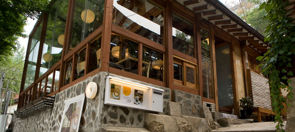 This cafe is renovated from a hanok that sits on a hill. It is quite easy to find because it is located by a large street in Samcheong-dong. The signature menu here is the “Dal Signature Set,” which has pat bingsu (shaved ice with red beans) served in a traditional pot alongside Korean-style waffles. Rest your legs and get your sugar boost with this sweet duo.