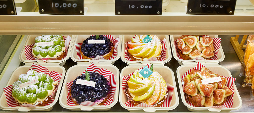 There are many kinds of bread available, including pretty tarts with fruits like strawberries, figs, cherries, and shine muscat grapes. Don't miss the Meossungmeossuk, a chewy bun filled with red beans and savory bean-powder cream.