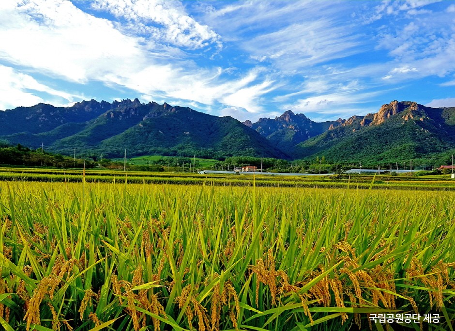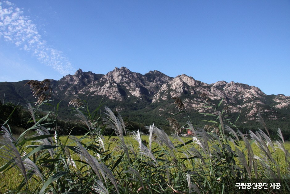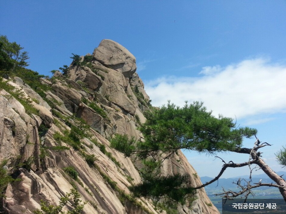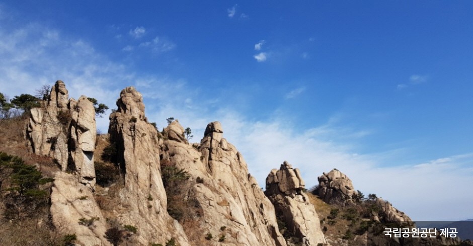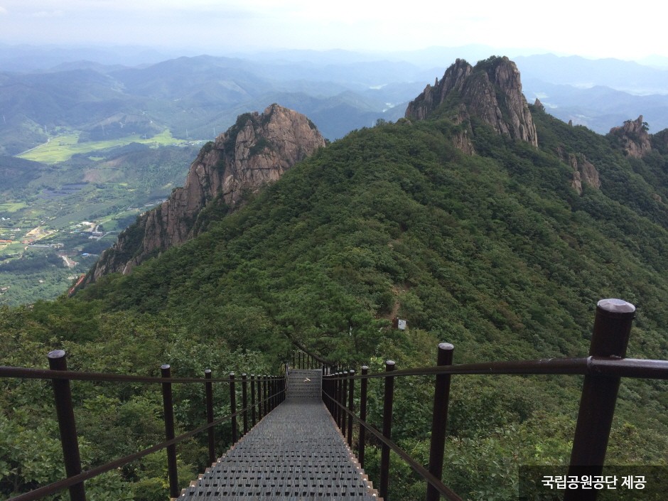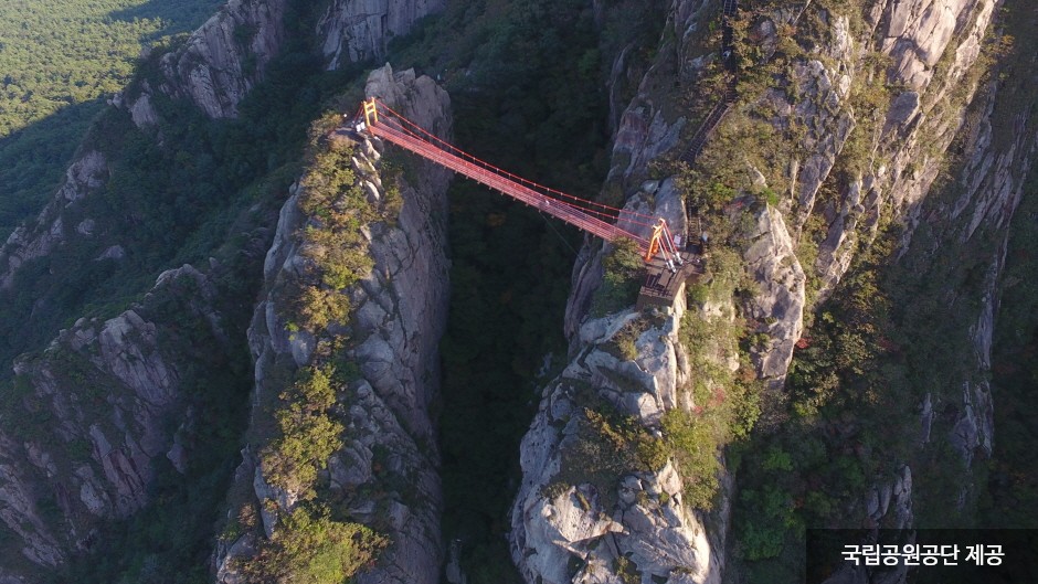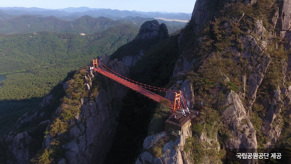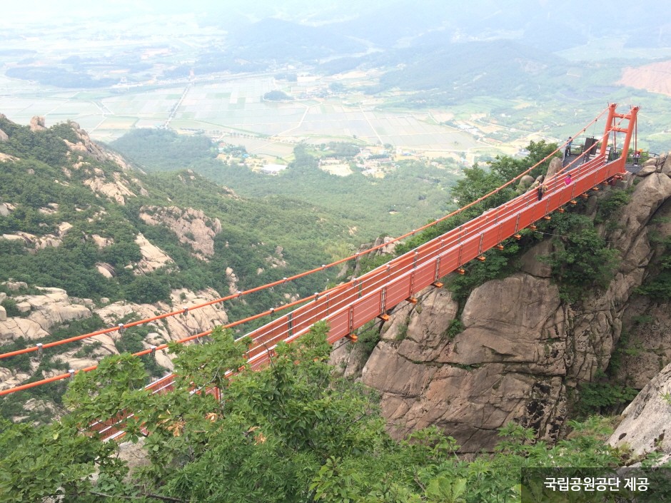 Wolchulsan Mountain, which means "moon rising mountain," is a national park in the southernmost part of Korea with beautiful nature. The mountain towering around Cheonhwangbong Peak at 810.7 meters above sea level stands out even more due to the flat land around it. The unique rock formations look differently depending on the angle, as a human face or animal shape, exuding overwhelming grandeur. More than 700 plant species and 800 animal species inhabit the area, and a subtropical forest and a warm-temperate forest coexist, making it very valuable to preserve. The ridge from the Cheonhwangsa Temple site or Baramgyegok Valley to Cheonhwangbong Peak, Gujeongbong Peak, and Dogapsa Temple is the main trail, which takes about six hours. The course’s most exciting point is the 120-meter high and 54-meter long red suspension bridge that offers a picturesque view of Wolchulsan Mountain and the fields and paddies under the mountain.