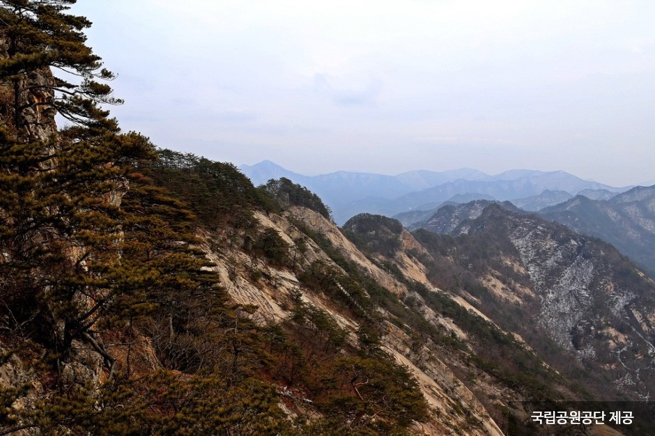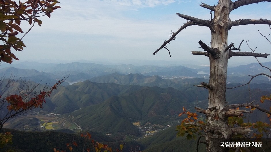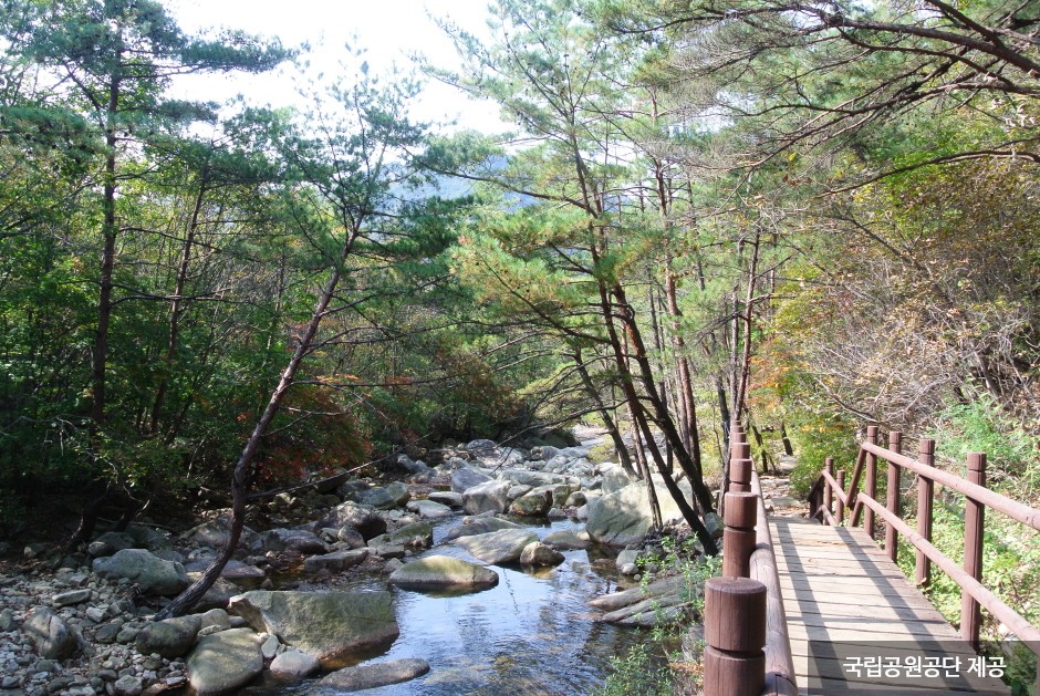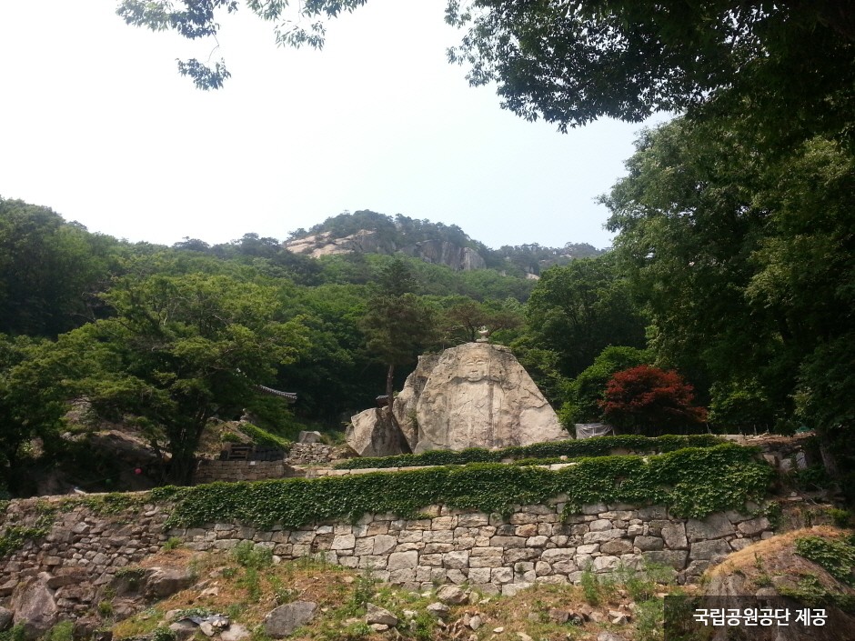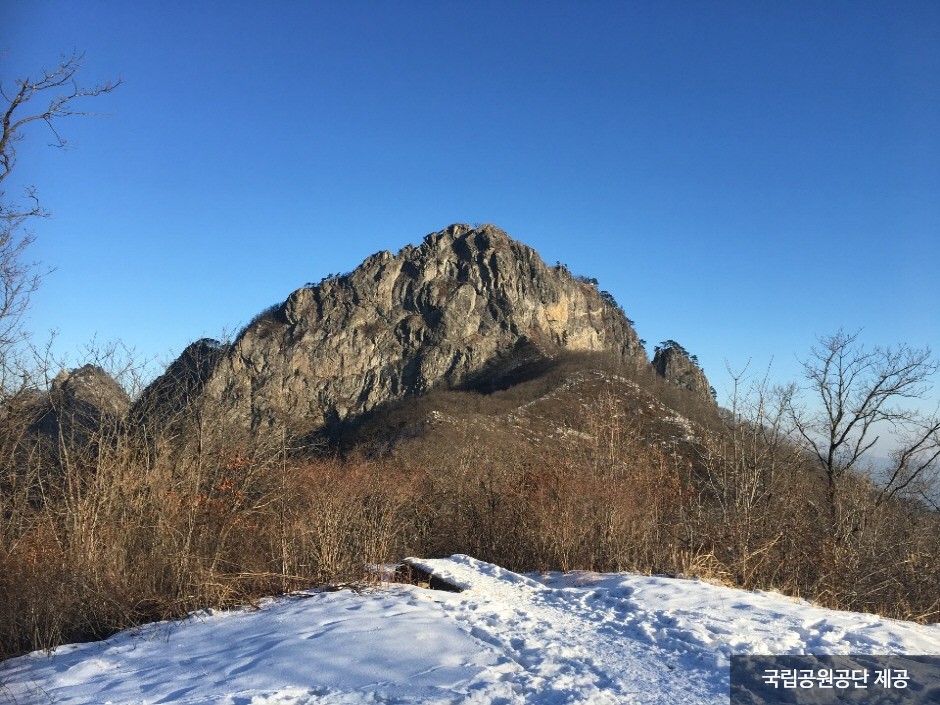 Woraksan National Park is located along the Baekdudaegan Mountain Range between Sobaeksan and Songnisan Mountains. The rugged mountain is softened by the waterfalls and small pools found within the valleys. The area was designated as a national park on December 31, 1984. The mountain is surrounded by Chungjuho Lake to the north, the Eight Scenic Views of Danyang and Sobaeksan Mountain to the east, and Mungyeongsaejae Pass and Songnisan Mountain to the south. The main peak of Woraksan National Park is Yeongbong Peak, reaching an altitude of 1,097 meters above sea level. The path there is steep, with sections of rock stretching 150 meters in height. There is also a 4-kilometer-long path circling the base rock.