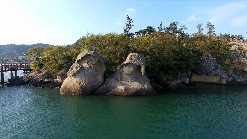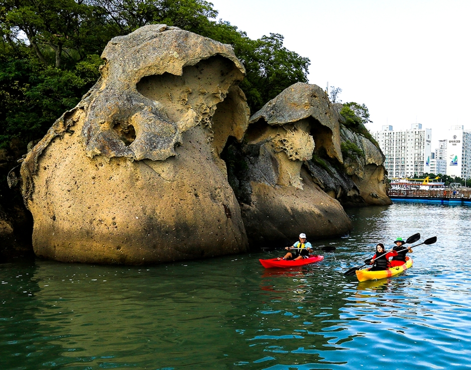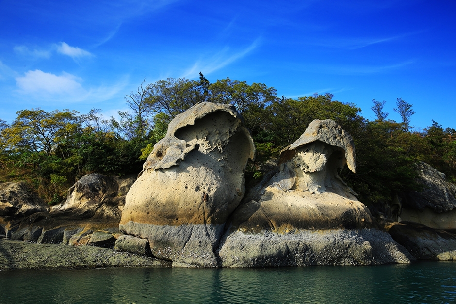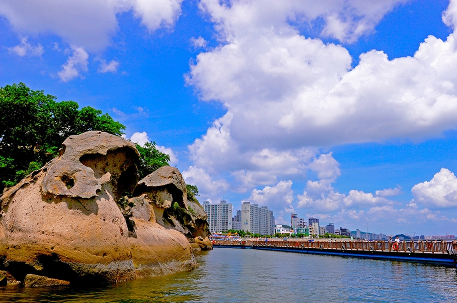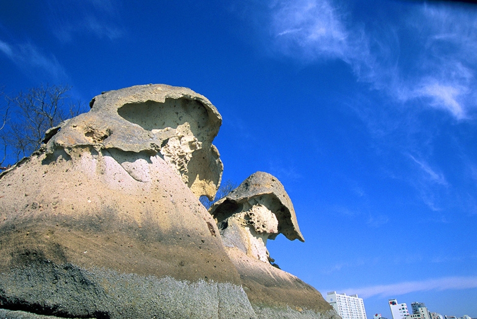 Located on the coast of Yonghae-dong in Mokpo, Gatbawi is a natural sandstone and tafoni formation near the mouth of the Yeongsangang River, where freshwater runs into the sea. Gatbawi is named after its shape, which is said to look like two men wearing traditional Korean hats called “gat” (“bawi” meaning “rock”). The rock is actually made of two individual formations: one measuring 8 meters tall and one 6 meters tall. Valued not only for its aesthetics, Gatbawi Rock is of high geological value as a “natural sculpture” that was formed as a result of years of weathering. The rock formation was officially recognized as a Natural Monument on April 27, 2009.