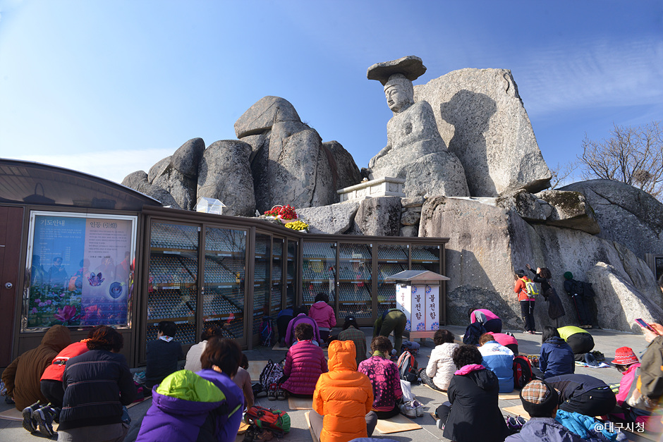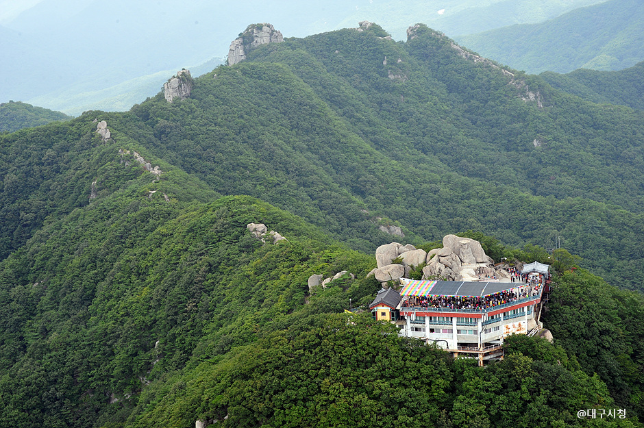 Palgongsan Nature Park, located in the Taebaek Mountain Range, features three peaks: Birobong Peak (1,192m), Yeombulbong Peak (1,042m), and Seobong Peak (1,150m). This mountain area boasts stunning rock formations and valleys. At an elevation of 852 meters on Gwanbong Peak, the Gatbawi Rock is renowned for fulfilling wishes. Other attractions include Donghwasa Temple, the Palgongsan Cable Car, and the Donghwasa Tourist Complex.