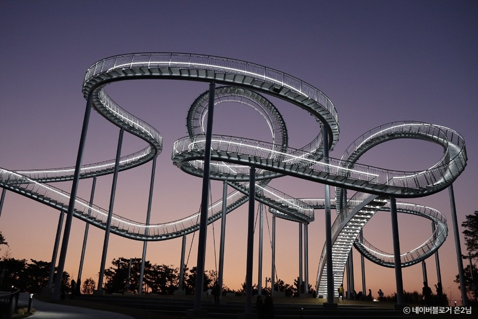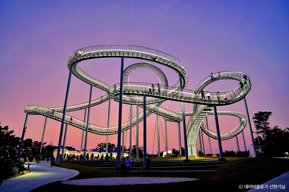 Space Walk is a unique track 333 meters high with 717 steps in total. The curved steel frame with bright lightings portray the symbol of Pohang "the city of steel and light." Visitors can enjoy a panoramic view of the city and factories, as well as enjoy amazing sunsets and sunrises.