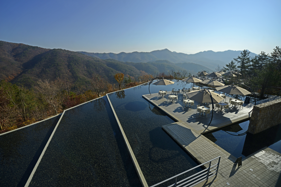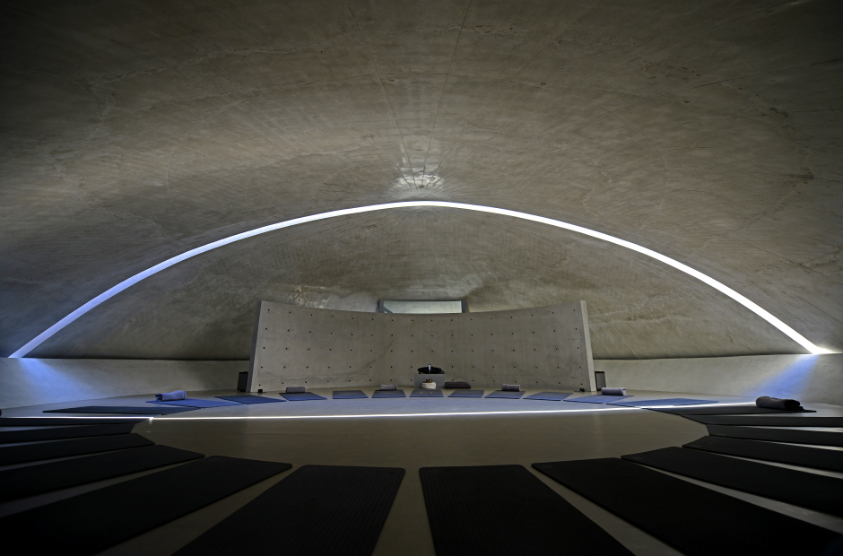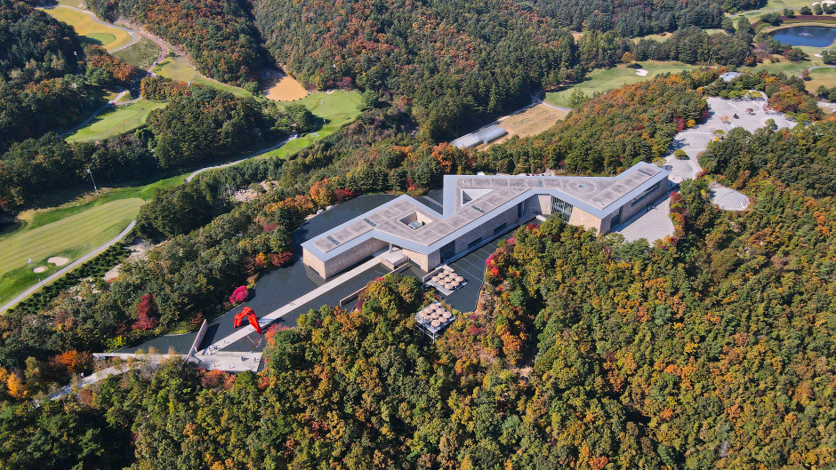 Museum SAN (Space Art Nature), hidden in the mountain, was designed by Tadao Ando, a legendary architect known for his minimalistic exposed concrete buildings. The museum opened in May 2013 with the last works of James Turrel, known for his work within the light and space movement. The museum is spread out in a line starting at the trail at the Welcome Center, to the lawn parking lot to the Flower Garden, Water Garden, Main Building, Meditation Hall, Stone Garden, and James Turrell Hall. The four wing-shaped structure of the Main Building is designed using squares, triangles, and circles, reflecting the architect's philosophy of connecting land, sky, and humans. Additionally, the museum runs various experience and educational programs in addition to its permanent and special exhibitions.