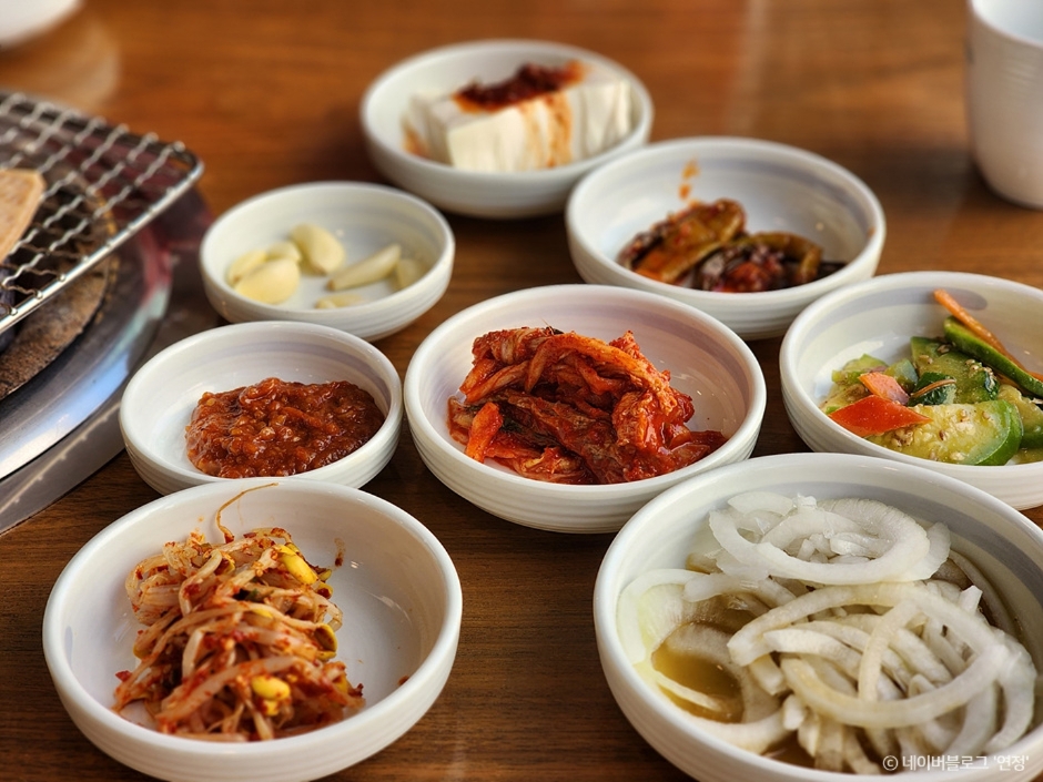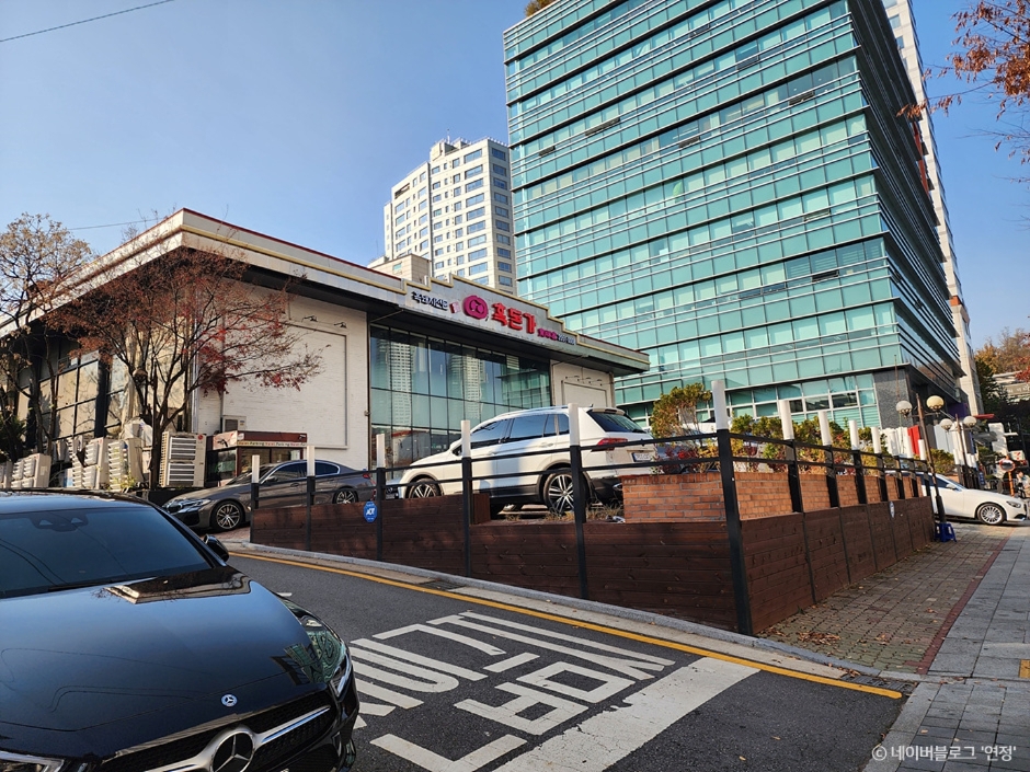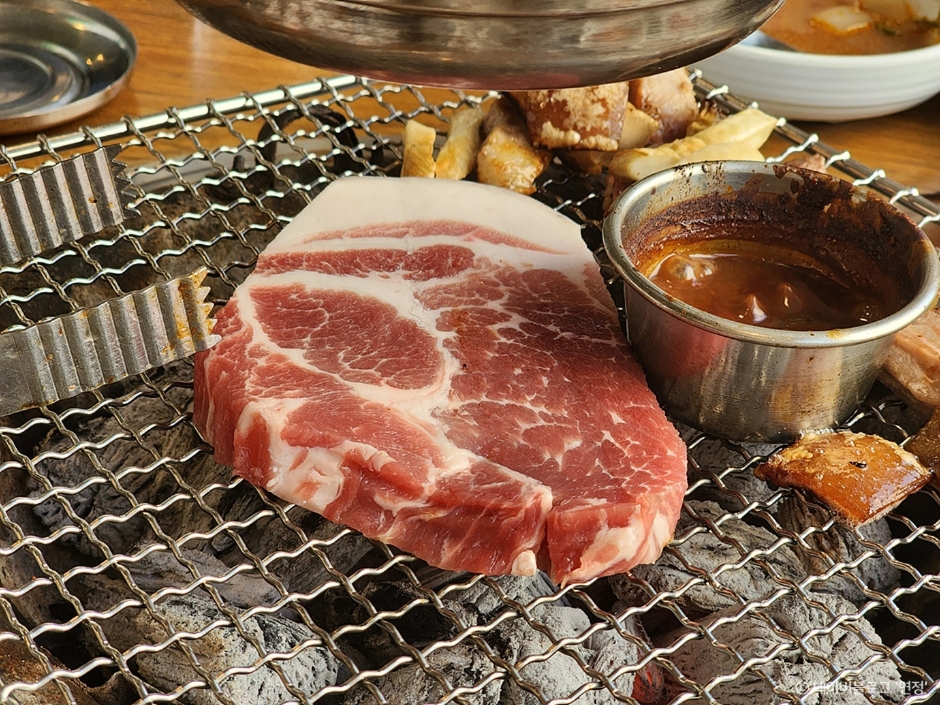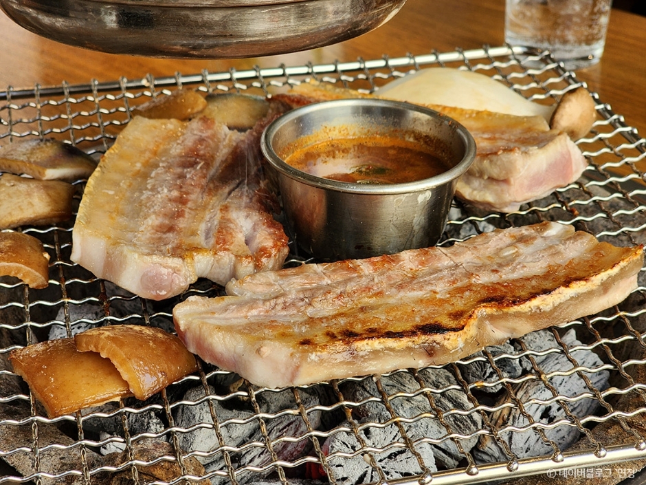 Heukdonga Samseong is a restaurant near COEX that serves Jeju-style dwaeji gui (grilled pork). The pork served here is Jeju heukdwaeji (Jeju black pork), cut into thick slices, charcoal-grilled, and either dipped into myeolchijeot (salted anchovies) or eaten with kkaennip jangajji (pickled perilla leaves). The grilling process drains the excess fat from the meat and imbues it with the scent of charcoal. Other menu items include sodeungsim jumulleok (stir-fried marinated sirloin) and naengmyeon (cold buckwheat noodles).