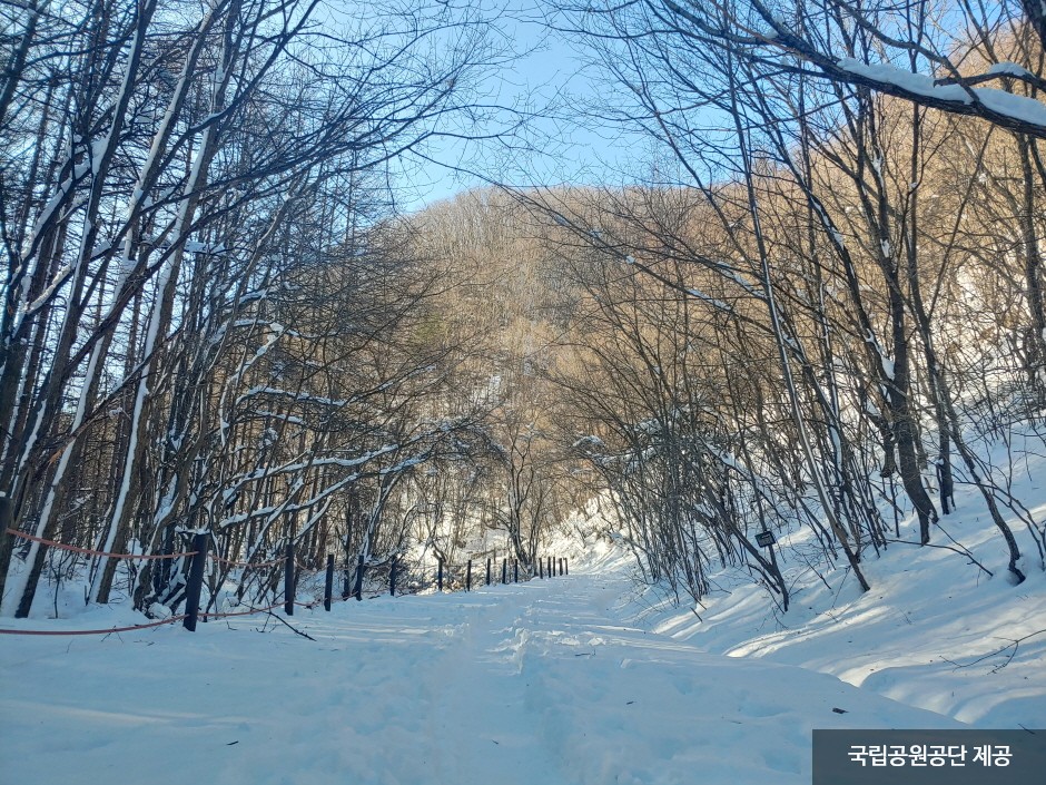 Taebaeksan Mountain range encompasses several peaks such as Yeongbong Peak (alt. 1,560 m), where in the past, people would conduct rites to venerate Heaven at Cheonjedan Altar; Janggunbong Peak (alt. 1,567 m), Munsubong Peak (alt. 1,517 m), and its summit of Hambaeksan Mountain (alt. 1,572 m). Taebaeksan Mountain serves as a home to diverse wild animals and plants, including several endangered species. The higher plains are covered with alpine vegetation. The mountain becomes hot pink with mountain rhododendron and azalea in the spring; green with thick forest and pristine waters in the summer; rainbow colored with changing leaves in the fall; and white with snow in the winter.